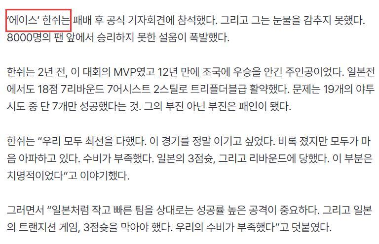 中國女籃“王牌”韓旭在戰敗後參與新聞發佈會掩飾不住眼淚,在8000名球迷面前悲傷爆發。韓旭表示“我們都盡力了,真的很想贏這場比賽,輸球大家都很傷心,防守不足,未能限制日本隊的三分球,沒有保護好後場籃板這些都是致命的。”