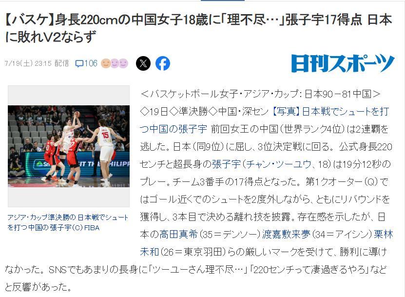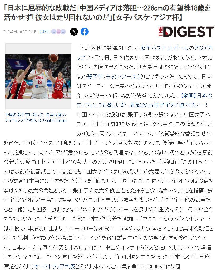 日媒《Digest》還報道——中國媒體對於中國女籃輸給日本隊很沮喪,他們甚至覺得是屈辱的一戰,中國隊沒有活用2.26米的超級新星張子宇,讓張子宇暴露了速度不足的軟肋。