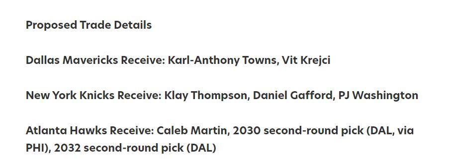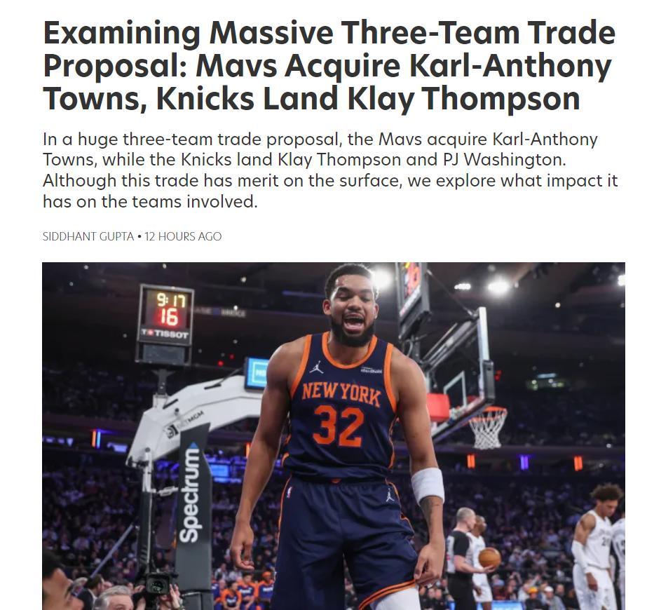 在尼克斯被淘汰後,卡爾-安東尼-唐斯傳出了一些交易流言,不過很快就被澆滅了,因爲尼克斯寧可解僱錫伯杜也不想拆散他們這套花費大力氣組建的頂級先發五人組,但美媒FW認爲只要籌碼合適尼克斯也會心動。