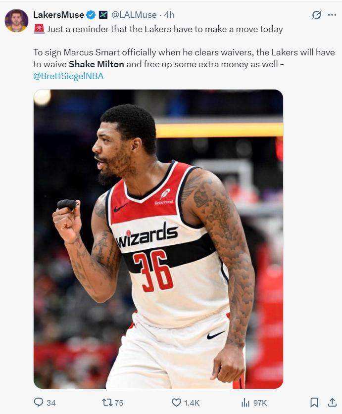 早些時候NBA記者Breet Siegel也透露,斯馬特即將度過澄清期,在這段時間內湖人必須要清理出薪金空間,裁掉米爾頓後還需要繼續清理,湖人今天必須繼續有所行動不然一切可能有變數。