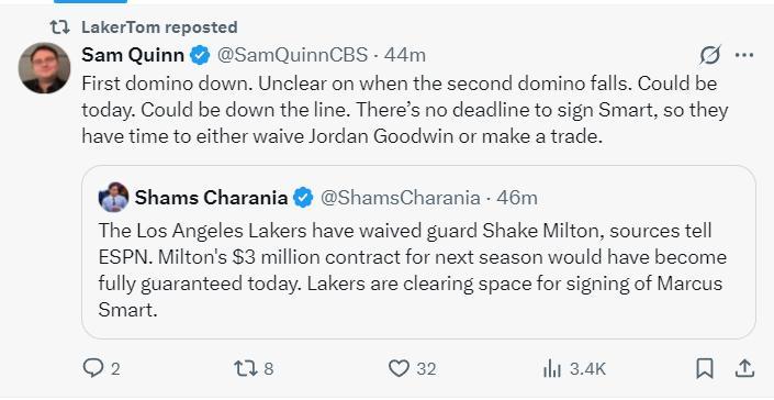 CBS記者薩姆-奎因寫道:第一張多米諾骨牌倒下了,誰是第二張還不得而知,可能就是今天,反正湖人必須有所運作,要麼裁掉古德溫,要麼進行交易,不然他們不夠空間來簽約斯馬特。