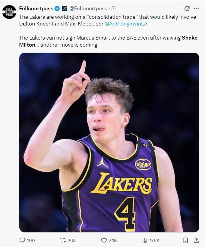 根據湖人記者安東尼-勞瑞恩的報道,湖人隊正在祕密籌劃一筆“整合交易”,改交易可能會涉及道爾頓-克內克特與克勒貝爾兩人。因爲湖人及時裁掉米爾頓也不足以使用雙年特例簽約斯馬特,球隊需要繼續運作清理薪金空間。