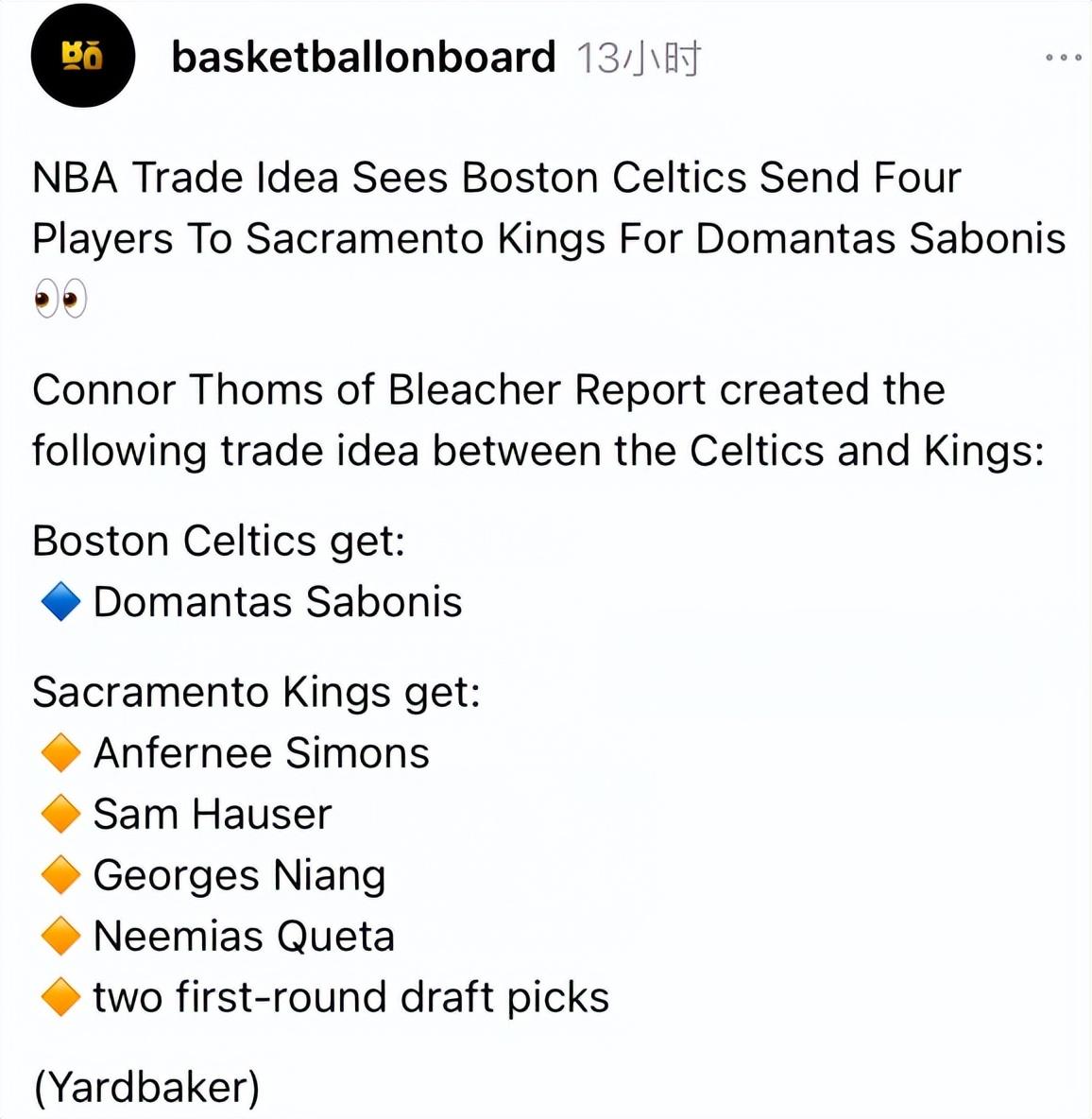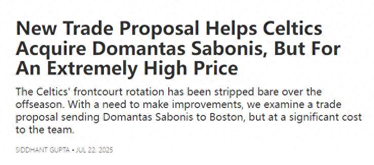美媒Basketballonboard也建議綠凱追逐小薩,他們覺得這筆6換1的交易很值得,小薩+布朗的組合在25-26賽季至少可以進入季後賽。
