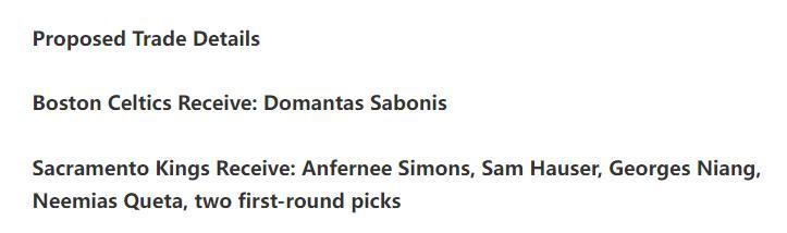 美媒FW建議凱爾特人在今夏交易得到國王隊的核心多曼塔斯-薩博尼斯,雖然這筆交易的代價會很大,但新賽季小薩+布朗的組合在東部肯定具有很大的競爭力。