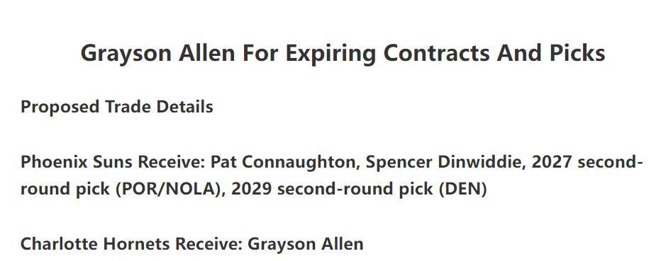 第一筆交易建議,太陽與黃蜂,黃蜂送出康諾頓、丁威迪、2027年開拓者/鵜鶘次輪、2029年掘金次輪得到阿倫。(太陽可以裁掉丁威迪陣容繼續年輕化)