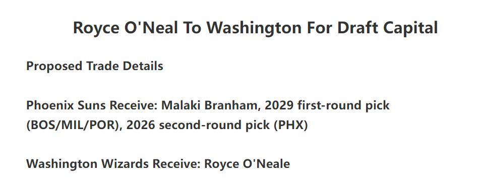第二筆交易建議,太陽與奇才交易,奇才送出布蘭納姆、2029年凱爾特人/開拓者次輪、2026年太陽次輪簽得到小奧尼爾;