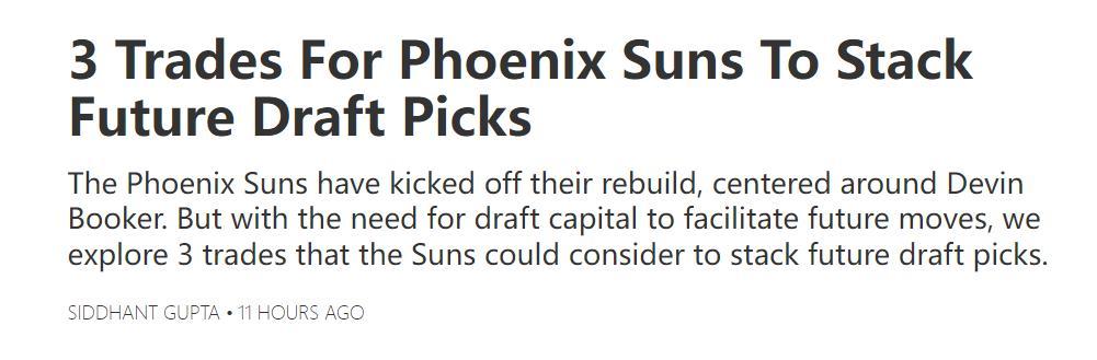 美媒FW認爲太陽的運作肯定會繼續下去,他們囤積了很多年輕的側翼與內線,阿倫、小奧尼爾、理查茲的合同可以利用起來繼續換回未來的選秀權,雖然他們無法換來首輪籤但次輪籤肯定是沒問題的,太陽作爲一支以布克、格林爲核心的年輕球隊他們需要的就是未來資產。