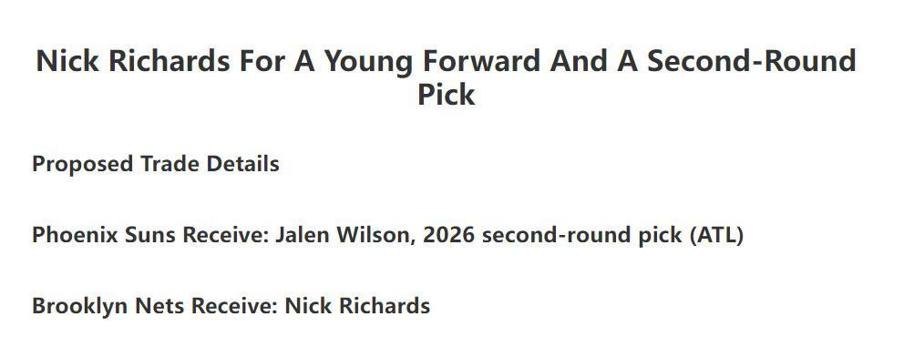 第三筆交易太陽與籃網交易,籃網送出杰倫-威爾森、2026年老鷹次輪得到理查茲。【這三筆交易爲太陽隊再獲得4次輪籤】