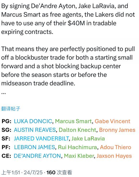 湖人媒體Laker Tom盛讚了佩林卡今夏的運作,他認爲佩林卡今夏的運作不僅僅是放眼未來也看中當下,因爲今夏湖人沒有送走任何一份到期合同,湖人也減稅到硬帽以下可以用雙年特例、拆分1410萬全額中產,更厲害的是湖人明夏有3個首輪可以交易。
