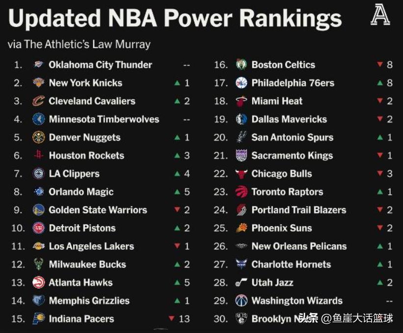 至於其他的球隊排名還是相對合理,尤其是尼克斯、掘金都做出了不小的改變,所以下賽季雷霆想要爭奪總冠軍還是非常艱難的。而剩下的排名當中,中游集團:9、勇士(上期第7),10、活塞(上期第12),11、湖人(上期第10),12、雄鹿(上期第14),13、老鷹(上期第18),14、灰熊(上期第15),15、步行者(上期第2),16、凱爾特人(上期第8),17、76人(上期第25),18、熱火(上期第16),19、獨行俠(上期第17),20、馬刺(上期第21)。可以看到在排名中勇士是力壓湖人,獨行俠、馬刺的排名更是不高,所以這也引起了很多的爭議。