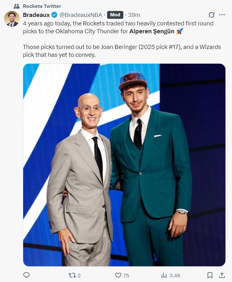 火箭記者Bradeaux寫道:四年前的今天(7月29日),火箭用兩個受保護的首輪籤從雷霆換來了申京,這些選秀權一個變成了2025年17順位貝蘭熱,還有一個是歸屬奇才尚未確定位次的首輪籤。(斯通當時的選秀眼光太出色)