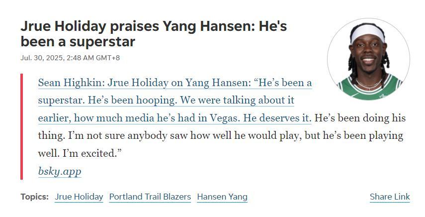 開拓者新援朱-霍勒迪也在採訪中談到楊瀚森夏聯的表現:他打得像個超巨,球打得真的挺棒。我們之前聊過他,他在拉斯維加斯受到了巨大的媒體關注,這是他應得的,沒有人能預料他可以打得如此出色,我很興奮可以跟他一同打球。