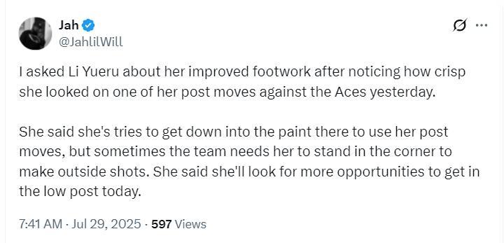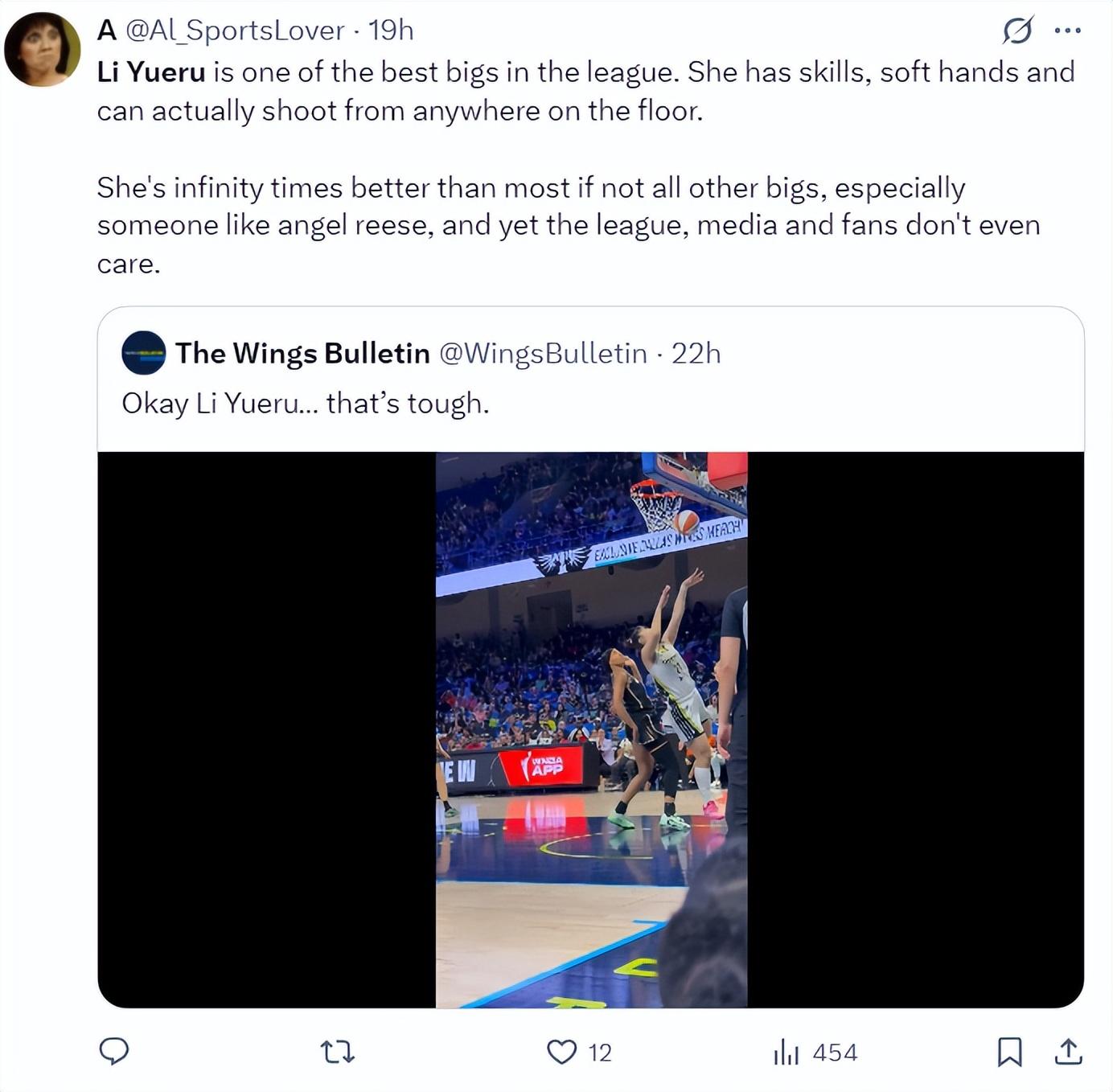 美球迷不滿飛翼教練組的安排:李月汝很明顯是WNBA聯盟最頂尖的中鋒之一,他技術嫺熟、投籃手型優美,她可以在場上任何位置投籃,她甚至比大多數頂尖球員(類似安吉爾-里斯)都要出色,然而聯盟、媒體、球隊、球迷卻絲毫不在意她。