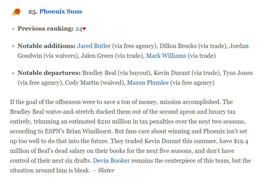 北京時間7月31日,ESPN的實力榜太陽是25,也就是聯盟倒數第六,他們交易得到狄龍、杰倫-格林、馬克-威廉姆斯,認領古德溫,簽下賈裏德-巴特勒,同時他們也送走了比爾、杜蘭特、瓊斯、馬丁、普拉姆利等人,太陽的即戰力肯定是大幅下滑,但他們休賽期的運作是爲了省錢,延伸條款裁掉比爾後讓他們處於第二土豪線之下削減了2.1億美元的奢侈稅重罰。