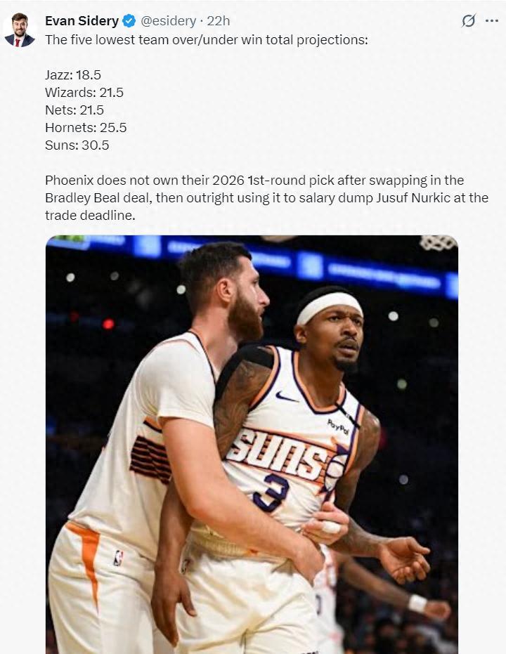 太陽2026年的首輪籤雖然在奇才手裏,但太陽在下賽季依舊可以選擇擺爛,因爲奇才預測戰績21.5勝比太陽還差,ESPN實力榜奇才排在第29位,所以這個互換權對於奇才來說沒有太大作用。
