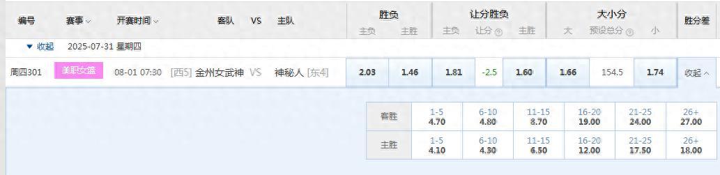 週四競彩籃球WNBA女籃只有一場比賽,而且主任開單關了!