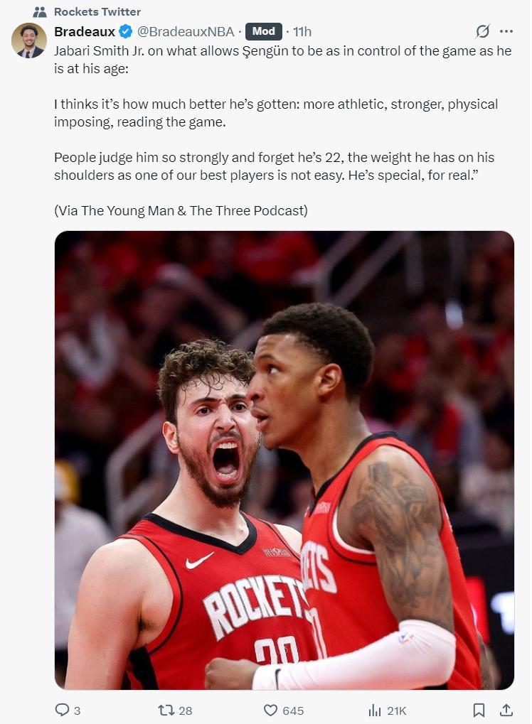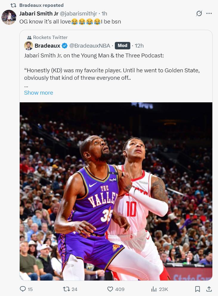北京時間7月31日,火箭球員小賈巴里-史密斯參與了《 Young Man & the Three》播客節目的錄製,他在這次的錄製中談到了火箭隊的多位隊友,他還直言KD是自己的偶像,KD是OG自己一直都深愛着他。
