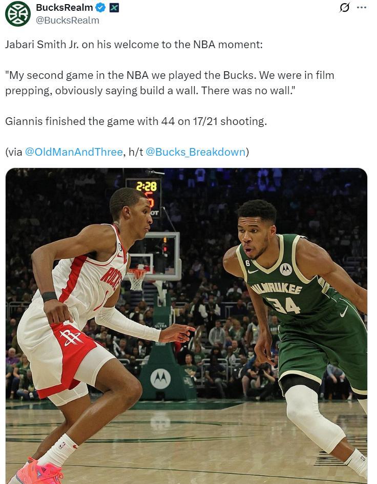 小賈還談到生涯第二場就是對陣揚尼斯的雄鹿,那場比賽揚尼斯21中17拿到44分,賽前我們都說要建築一道防線來限制揚尼斯,但顯然根本建築不起來。