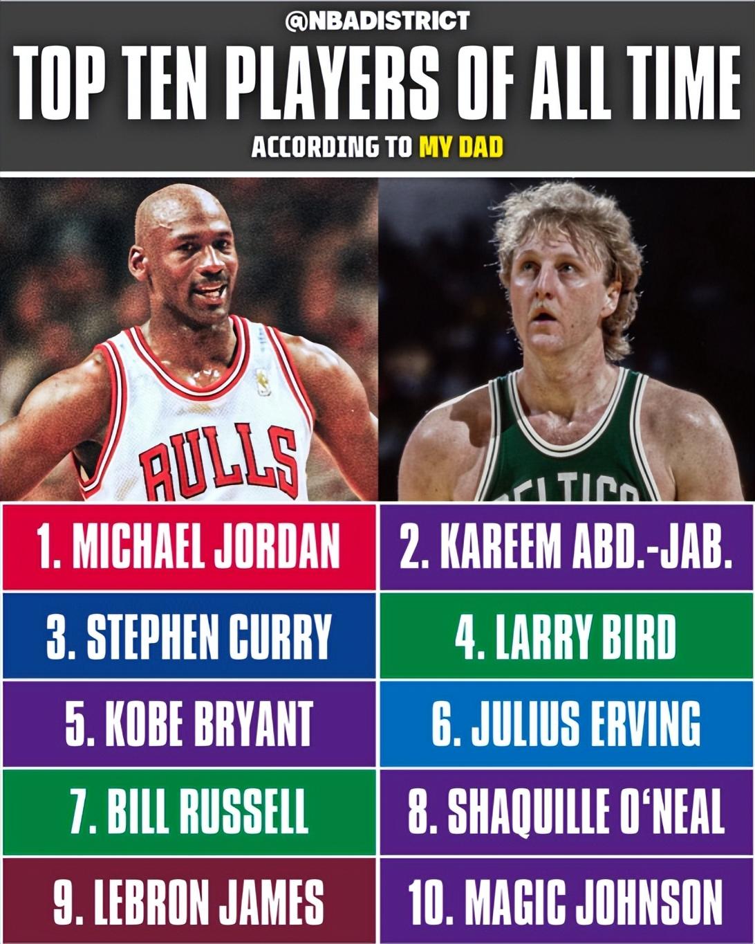 博主父親的歷史前十榜單:1.邁克爾-喬丹、2.天勾賈巴爾、3.斯蒂芬-庫裏、4.拉里-伯德、5.科比-布萊恩特、6.朱利葉斯-歐文、7.比爾-拉塞爾、8.沙克-奧尼爾、9.勒布朗-詹姆斯、10.魔術師約翰遜。