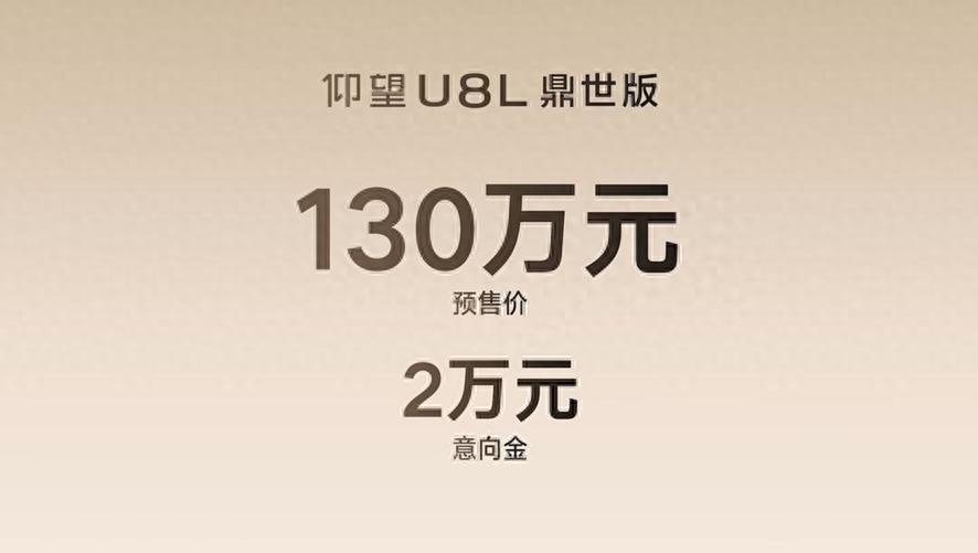 7月31日,仰望汽車旗下全尺寸行政豪華SUV仰望U8L鼎世版全球預售發佈會正式開啓,預售價130萬元,預訂意向金2萬元。