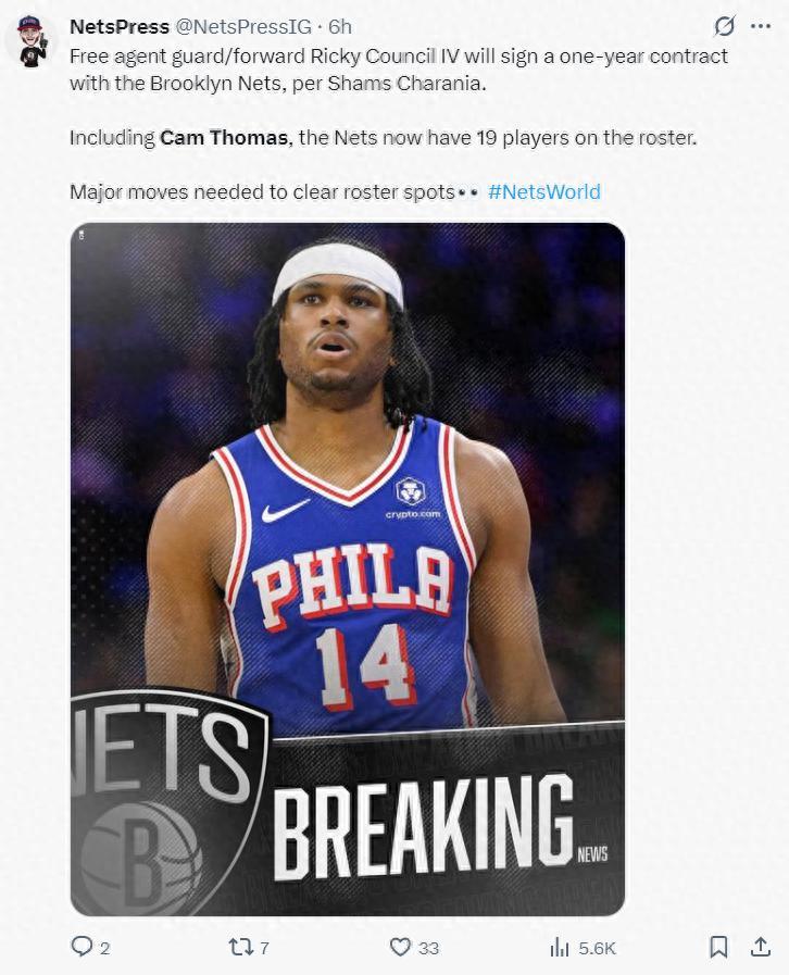 一天之前,根據Shams的報道,籃網將以一年的短約簽下自由球員康西爾,上賽季康西爾在聯盟打了73場比賽。根據籃網媒體NEtsPress的報道,籃網簽下康西爾後大名單上已經有19人,需要重大的運作來削減大名單。