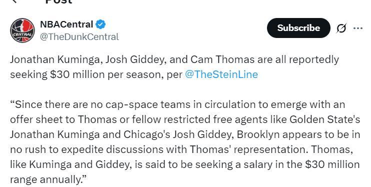 根據此前的報道,托馬斯、吉迪、庫明加三人都索要均薪超過3000萬的合同,這也是他們跟各自球隊極限拉扯的原因,勇士給庫明加的報價是兩年4500萬(第二年球隊選項+不保障),吉迪的報價還沒有確切的,托馬斯的報價是兩年2800萬(第二年球隊選項)。