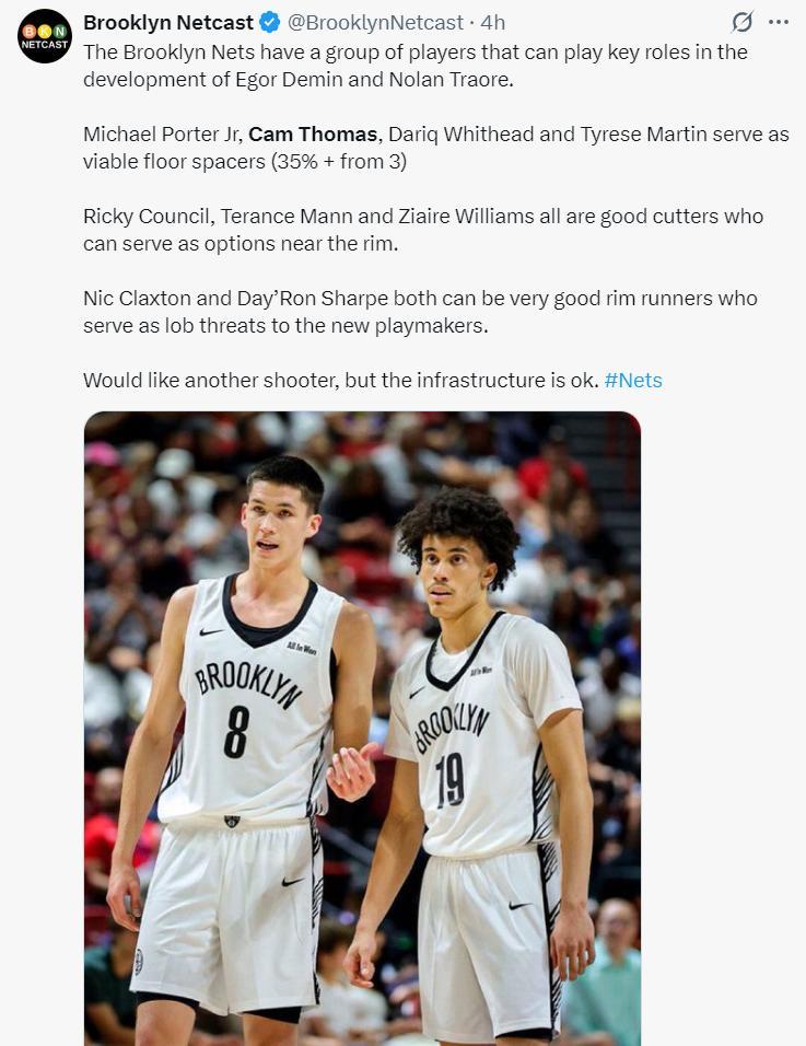 網媒認爲這支籃網有着明亮的未來,今夏選了四個首輪秀,還有小波特、托馬斯、懷特黑德、泰勒-馬丁等外線球員,內線有克拉克斯頓、夏普,這支籃網在不久的將來必然崛起。