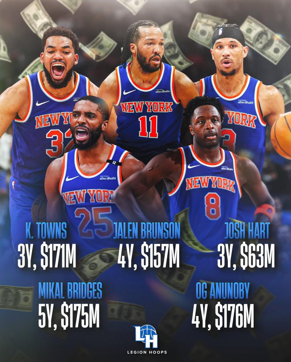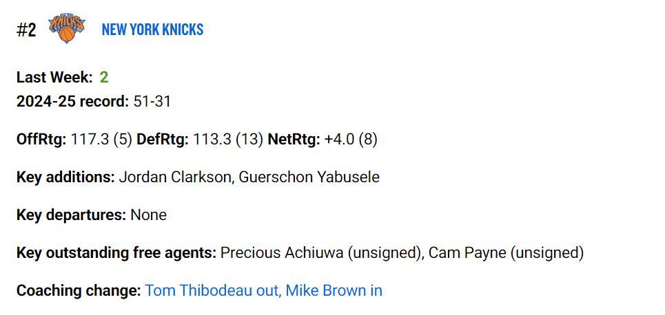 尼克斯穩居第二,他們今夏加入了喬丹-克拉克森、亞布塞萊兩位即戰力,還四年1.5億續約了米卡爾-布里奇斯,尼克斯五巨頭之後的薪水:哈特三年6300萬、阿奴諾比四年1.76億、大橋五年1.75億,唐斯三年1.71億,布倫森四年1.57億,他們的競爭力在東部不會差。