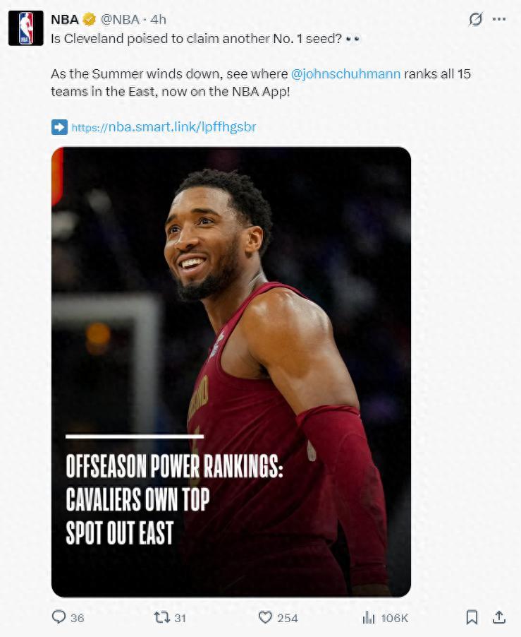 北京時間8月2日,NBA官方根據休賽期的運作對東部各隊進行了一個實力排名,克利夫蘭騎士隊第一,紐約尼克斯第二,奧蘭多魔術第三。