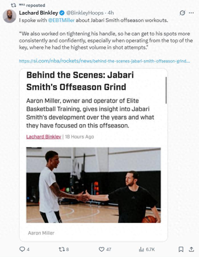 北京時間8月2日,火箭隊記蘭德里-賓克利報道,今夏火箭球員小賈巴里-史密斯與著名籃球訓練師艾倫-米勒一同訓練,艾倫-米勒致力於幫助小賈成爲更好的自己,小賈已經連續六週苦練(一週至少練6天,幾乎都練滿7天)。
