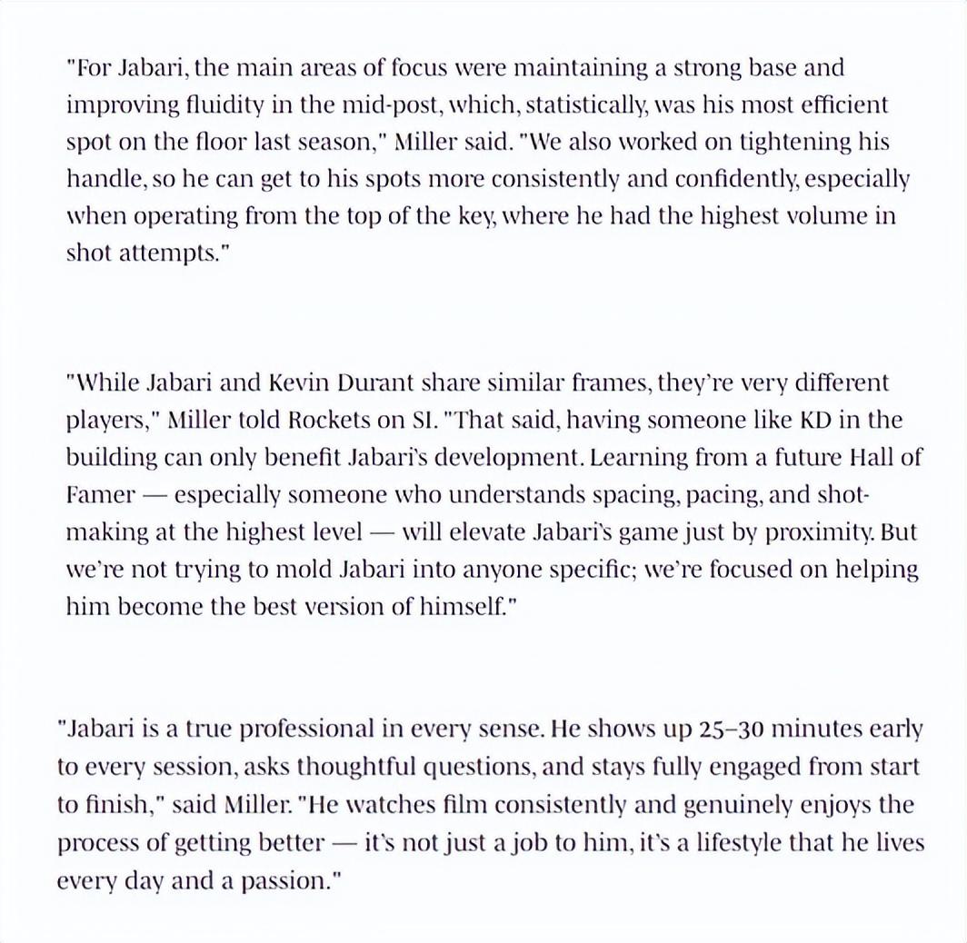 根據艾倫-米勒所說今夏訓練的目標是讓小賈巴里的投籃更加穩定,讓他在半場進攻中沒有死角,尤其是在正面、弧頂的出手,因爲那是他最擅長的區域。