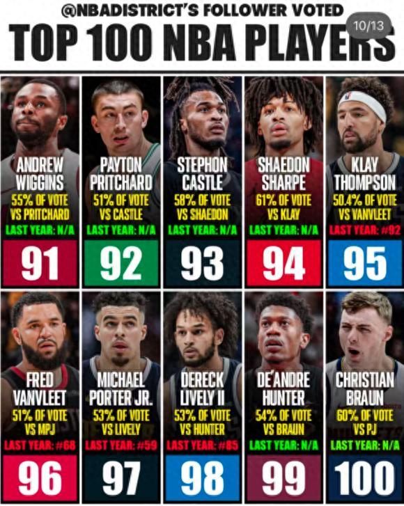100-91:布勞恩、亨特、萊夫利、小波特、範弗利特、克萊、夏普、卡斯爾、普理查德、維金斯。(嘴哥僅僅第91?小波特作爲頂薪球員才97?範弗利特上賽季拿4100萬啊才96?)