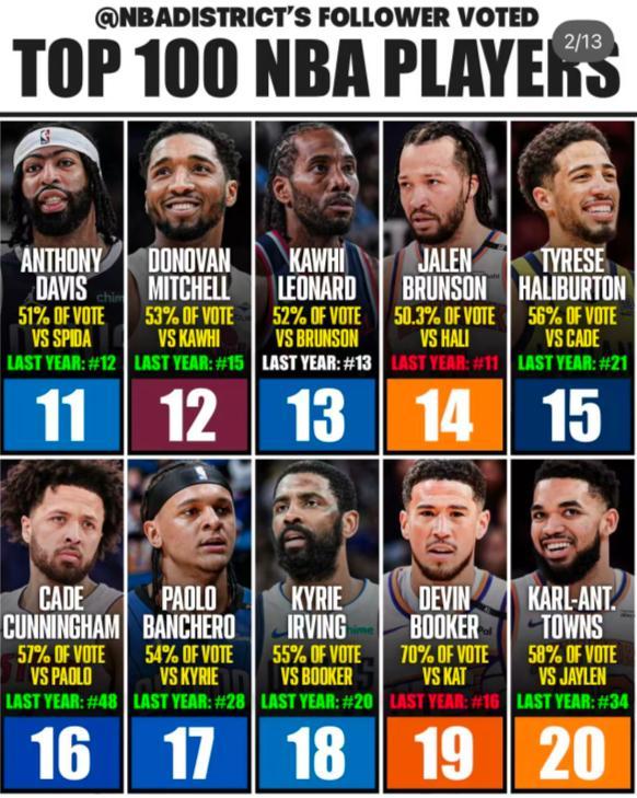 20-11:唐斯、布克、歐文、班凱羅、坎寧安、哈利伯頓、布倫森、倫納德、米切爾、戴維斯;(坎寧安上升了32個位次太猛了)