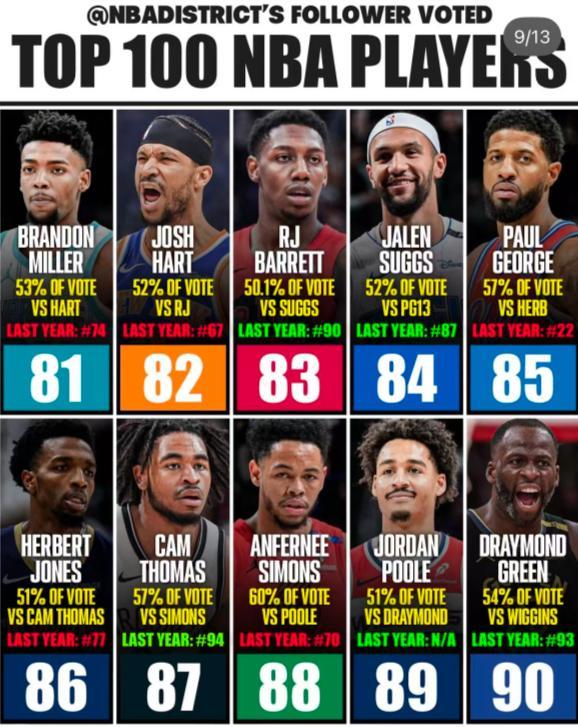 90-81:追夢格林、普爾、安芬尼西蒙斯、托馬斯、赫伯特-瓊斯、喬治、薩格斯、巴雷特、哈特、米勒。(喬治只能排聯盟第85位了?)
