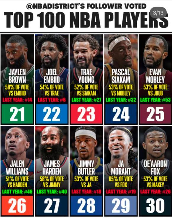 30-21:福克斯、莫蘭特、巴特勒、哈登、傑威、莫布利、西卡、特雷楊、恩比德、杰倫布朗;(我登從40上升到27,恩比德從6下滑到22,布朗也下滑了7個位次,巴特勒下滑了10個位次)