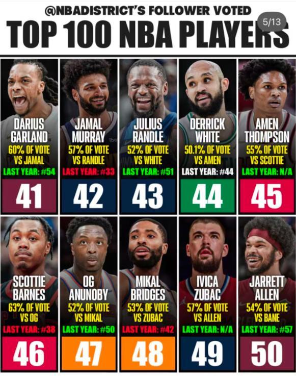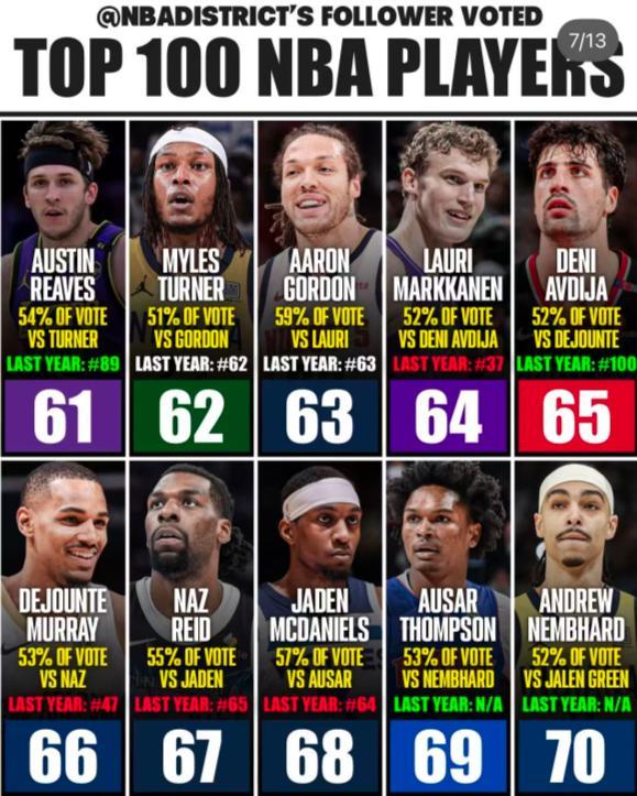 10-1:文班亞馬、杜蘭特、華子、塔圖姆、詹姆斯、庫裏、亞歷山大、東契奇、揚尼斯、約基奇;(只有雷霆有6人進入前100,40歲的勒布朗還上升了2個位次,杜蘭特與庫裏都跟去年一樣)