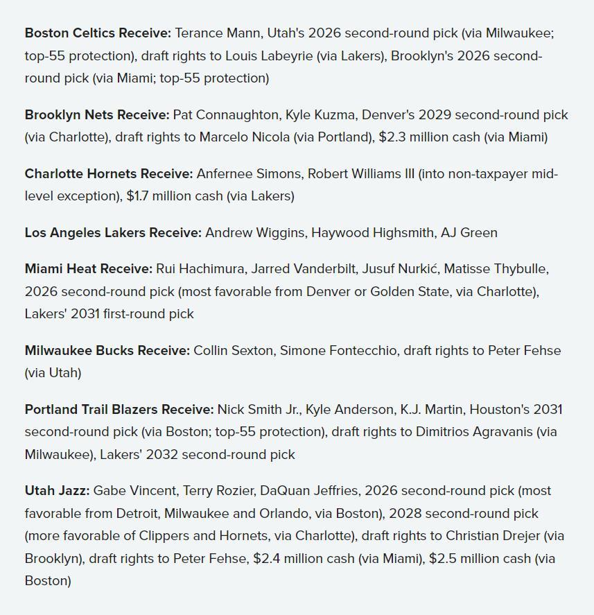 凱爾特人得到:曼恩、爵士26年次輪籤(前55保護)、拉貝利的簽約權、籃網2026年次輪籤(前55保護);