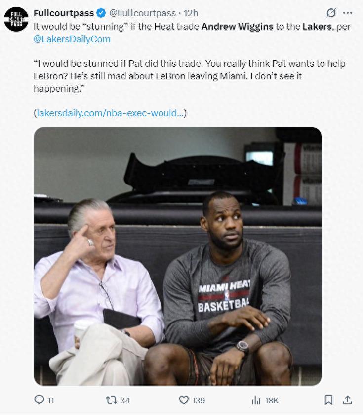 北京時間9月21日,知名湖人媒體Lakers Daily透露,如果熱火將安德魯-維金斯送到LAL那將讓人震驚,因爲萊利不可能幫助勒布朗,他還在因爲勒布朗離開邁阿密而生氣,我覺得這不太可能發生。