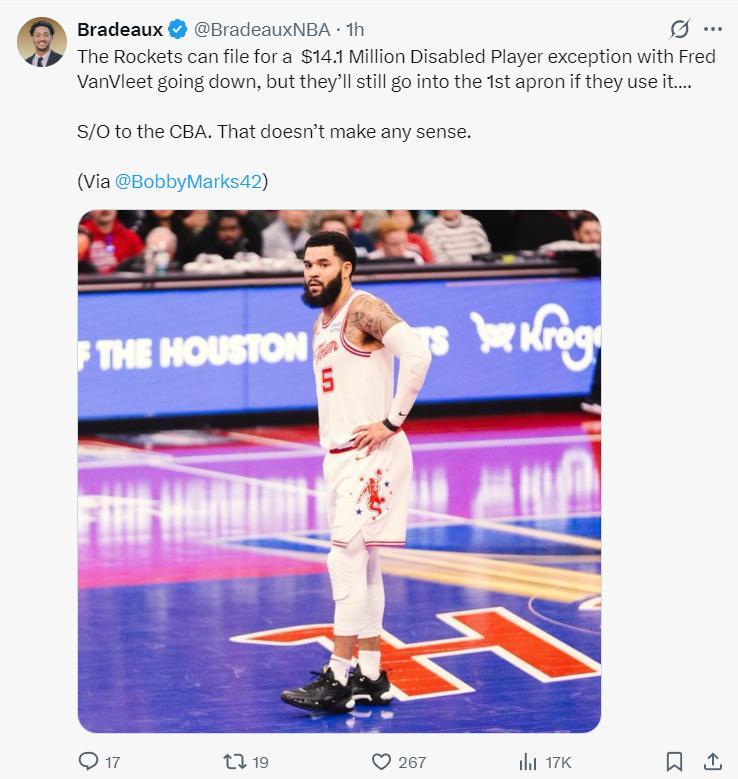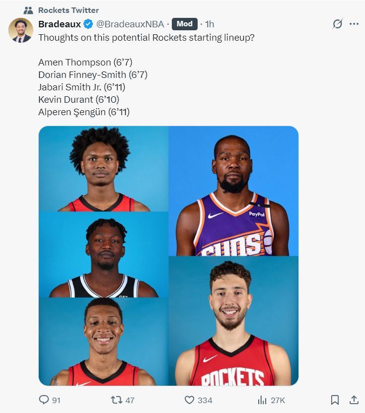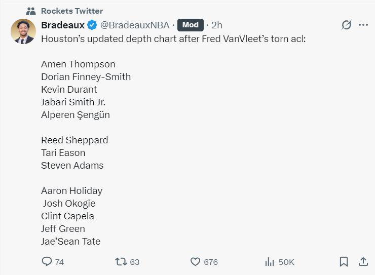 他曬出範弗利特遭遇賽季報銷後火箭隊的陣容: