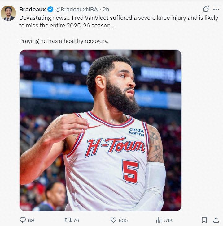 北京時間9月23日,ESPN記者Shams報道,火箭隊後衛弗雷德-範弗利特遭遇了嚴重的膝蓋傷病,他很有可能要缺席整個25-26賽季,他今夏剛剛與火箭達成兩年5000萬的續約合同,據悉範弗利特是遭遇了膝蓋前交叉韌帶撕裂。