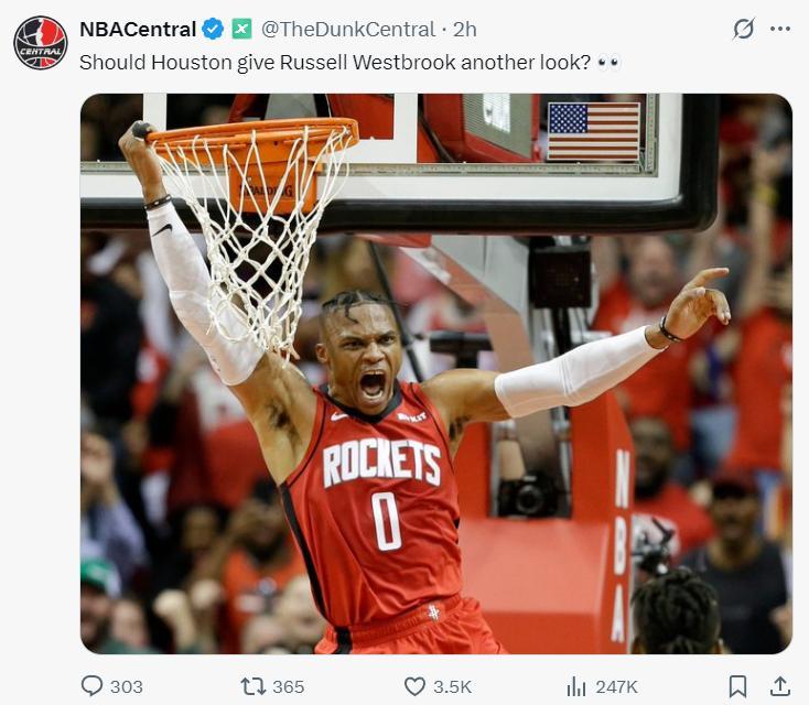美媒NBA Central詢問火箭球迷:休斯頓再給拉塞爾-威斯布魯克一次機會可以嗎?