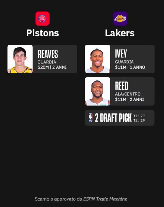 第三筆方案是與活塞交易,湖人送出裏夫斯得到艾維、裏德、27年首輪籤、29年次輪籤。