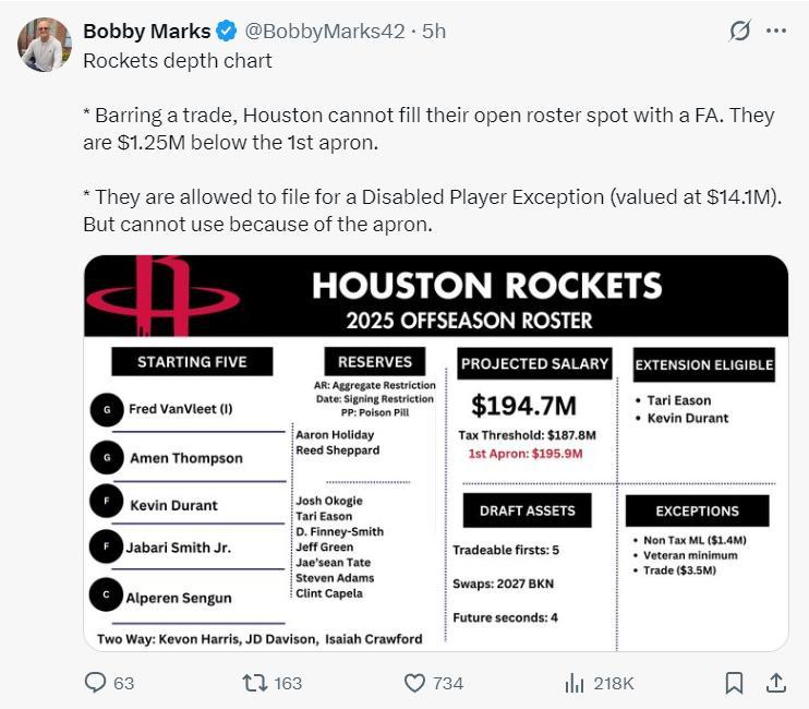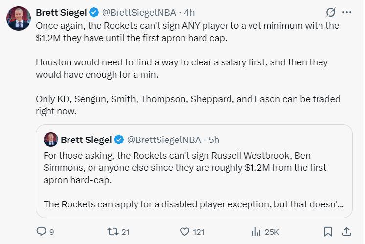 根據另一記者Brett Siegel的報道,如果火箭想要從自由市場上籤約控衛來補強的話他們必須通過交易清理薪金空間,因爲他們距離第一土豪線125萬誰也籤不了,125萬低於老蔣底薪的最低標準,火箭隊得先解決薪金空間的問題。