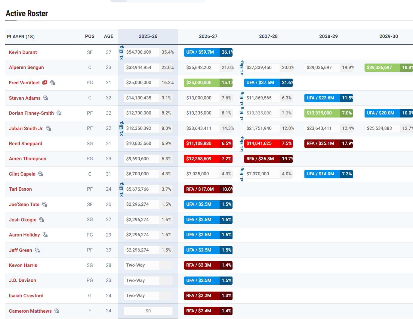 目前火箭隊內只有杜蘭特、申京、小賈巴里、阿門、謝潑德、伊森等球員可以交易,這些人都是火箭的基石盤太可能被交易。