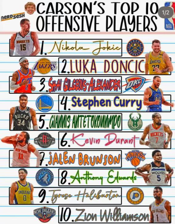 卡森評選的聯盟前十進攻超巨:1.尼古拉-約基奇、2.盧卡-東契奇、3.亞歷山大、4.斯蒂芬-庫裏、5.揚尼斯-阿德託昆博、6.凱文-杜蘭特、7.杰倫-布倫森、8.安東尼-愛德華茲、9.泰雷斯-哈利伯頓、9.錫安-威廉森;