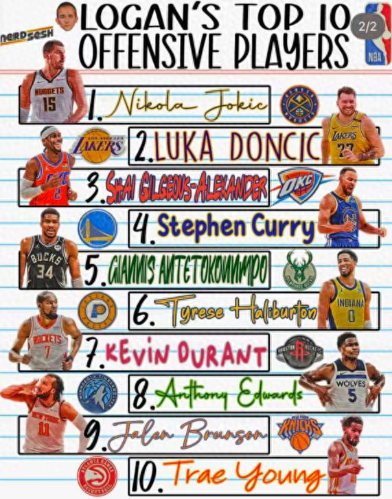 羅根評選的進攻前十:1.尼古拉-約基奇、2.盧卡-東契奇、3.亞歷山大、4.斯蒂芬-庫裏、5.揚尼斯-阿德託昆博、6.泰雷斯-哈利伯頓、7.凱文-杜蘭特、8.安東尼-愛德華茲、9.杰倫-布倫森、10.特雷楊;