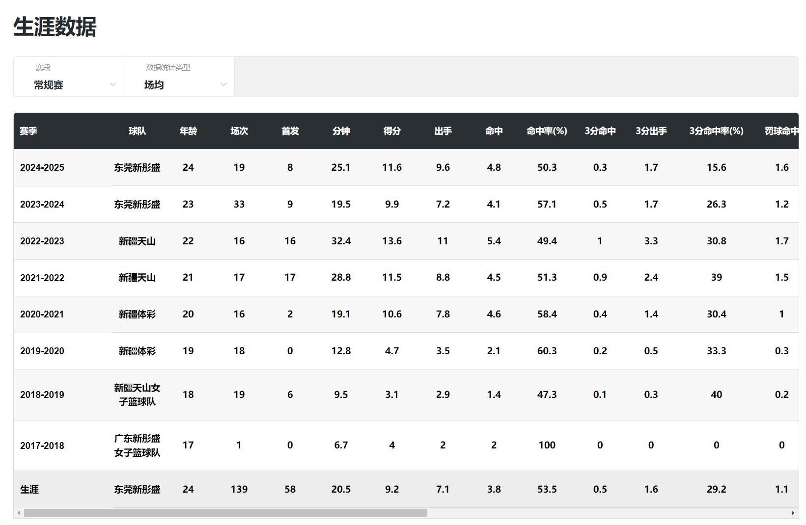 陳明伶是廣東青訓培養的球員,她已經在WCBA征戰了8個年頭,上賽季在廣東場均25.1分鐘,拿到11.6分5.6籃板1.3助攻1.1搶斷0.3蓋帽,命中率50.3%,她還沒有進入巔峯期。