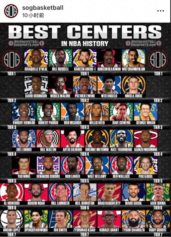 北京時間9月24日,美國媒體Sogbasketball爲歷史最佳中鋒分成7個檔次,現役只有約基奇、恩比德、霍福德、大洛、戈貝爾五人入內,排位最高的約基奇第二檔。