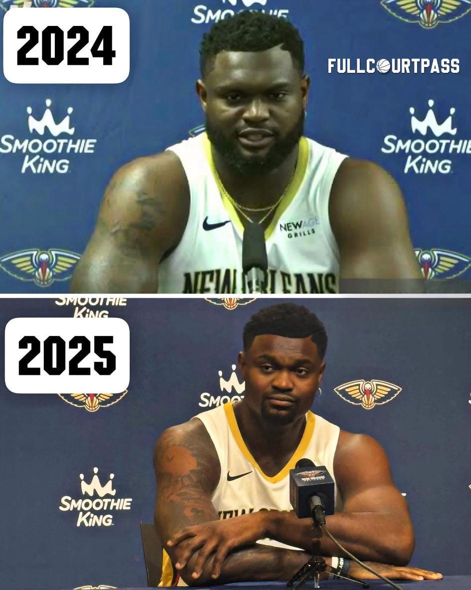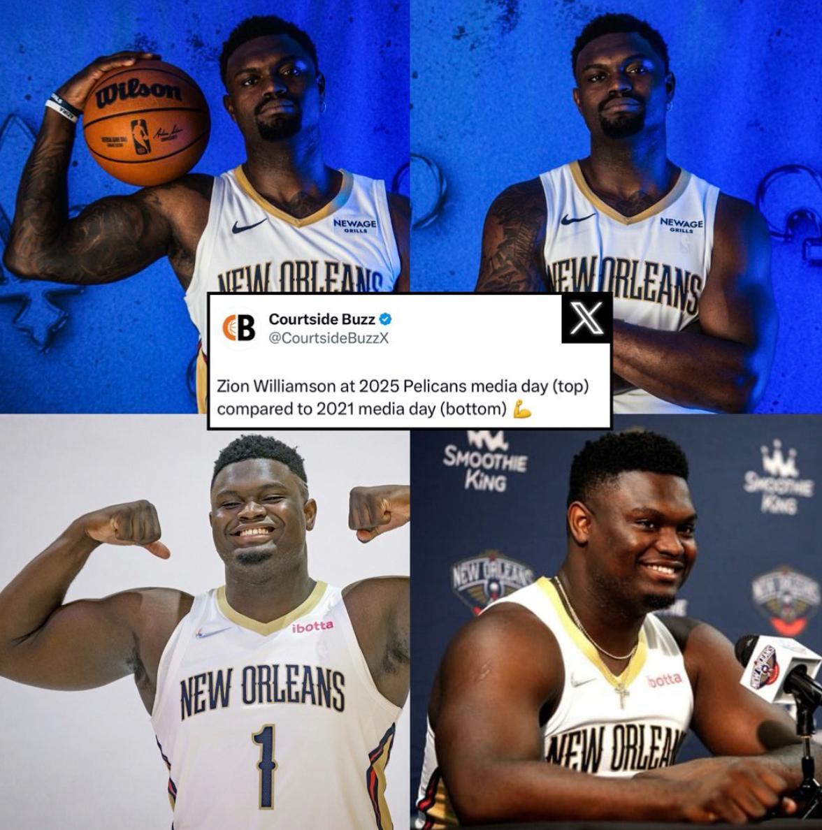 美媒CB還曬出了2021年夏媒體日接受採訪時的錫安與2025年夏媒體日錫安的對比圖,感覺錫安不再是那個265斤的大胖子,雖然他沒有說自己減重多少斤,但從對比圖來看20-30斤應該是有的。