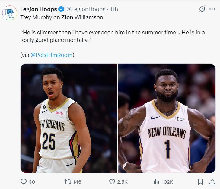 錫安的隊友墨菲談到今夏再度見到錫安時的感覺:他比我任何一個夏天見到時都要更瘦,他的心態一直都很好。